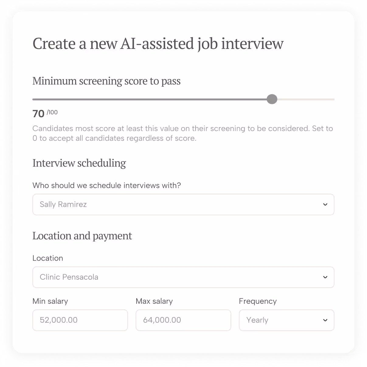 Tell Anna what matters for your role. Licenses. Certifications. Years of experience. Behavioral competencies. Scheduling requirements. Anna builds the interview plan and scoring rubric from your criteria.