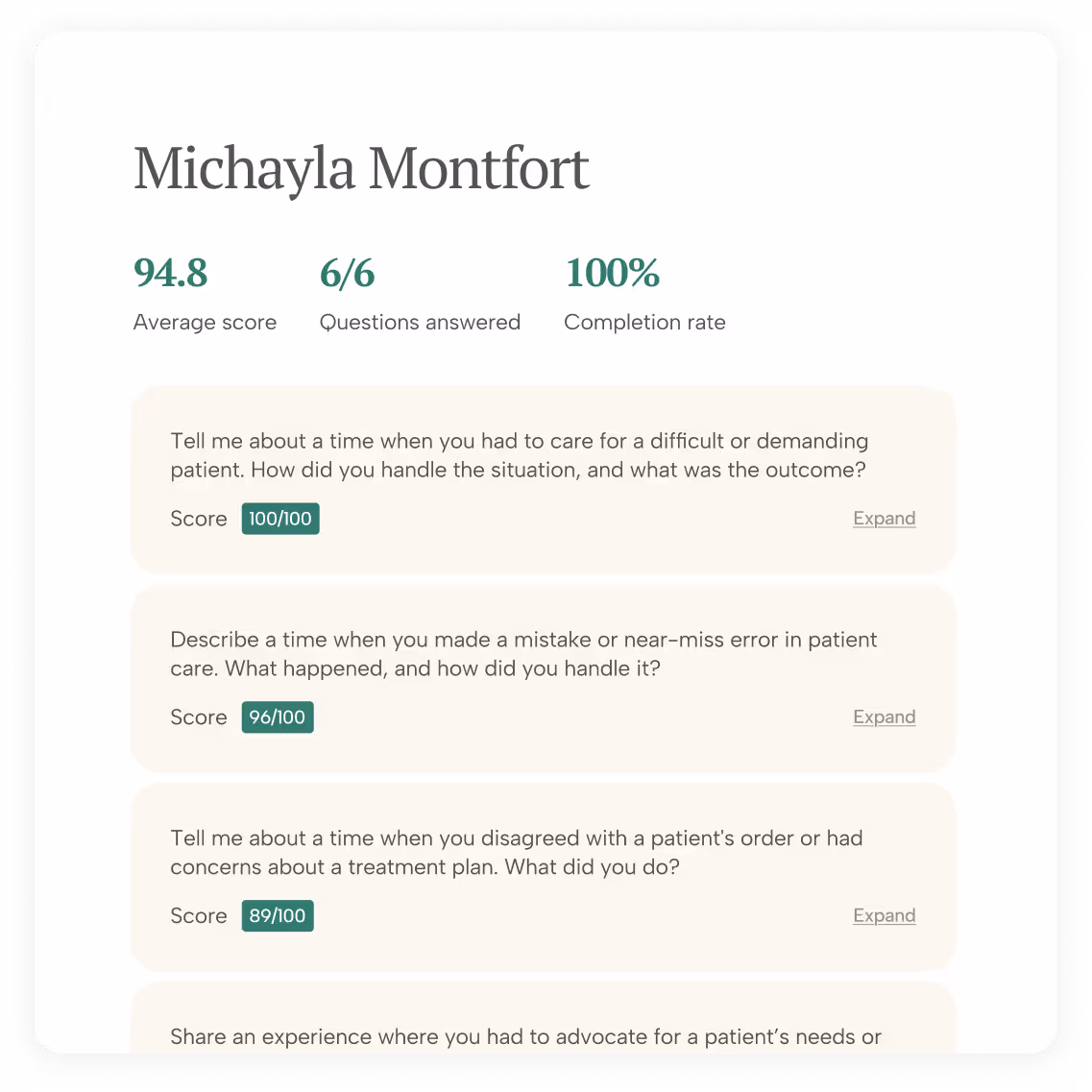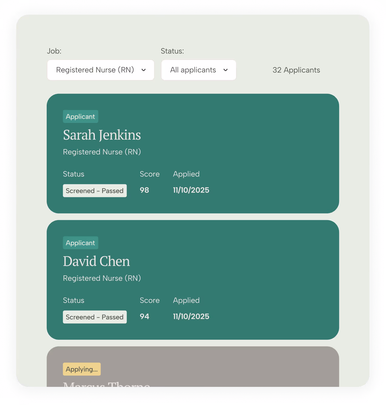 Anna engages every applicant in a natural text conversation no matter the hour. She asks the behavioral questions that uncover real qualifications. She probes for critical experience with dementia care, wound management, behavioral health, or whatever matters for your role. She verifies licenses and certifications. She assesses culture fit.