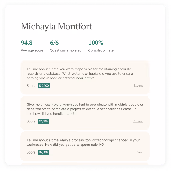 Job-specific requirements, behavioral questions and scoring rubrics. She conducts role-specific screening for all of your roles.